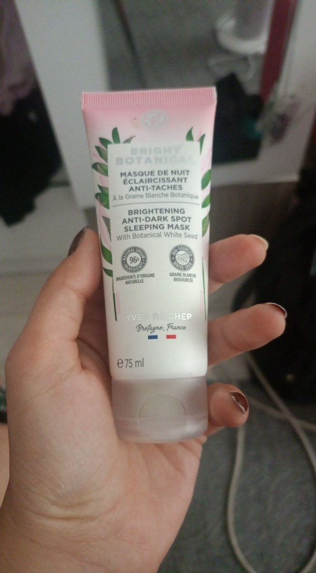 Yves Rocher aydınlatıcı, leke karşıtı gece maskesi, botanik beyaz tohum özlü 75 ml tüpte doğal içeriklerle cildi aydınlatır ve koyu lekeleri azaltır.
