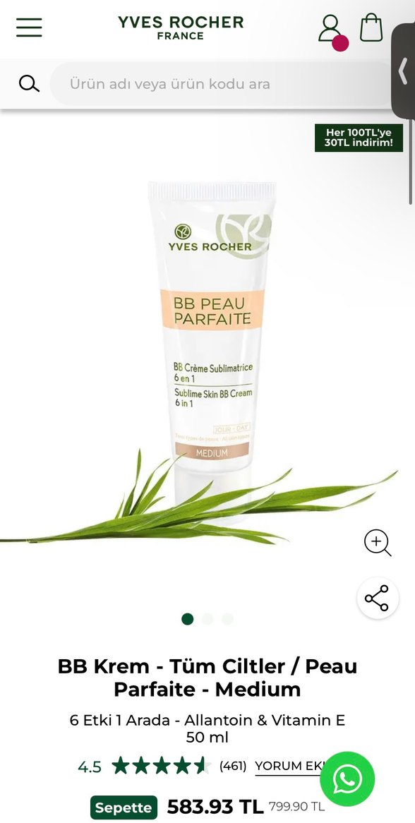 Yves Rocher BB krem, tüm ciltler için uygun, 6'sı 1 arada etkili ve medium bej tonunda doğal bir görünüm sağlar. 3 4 defa anca kullanılmıştır.