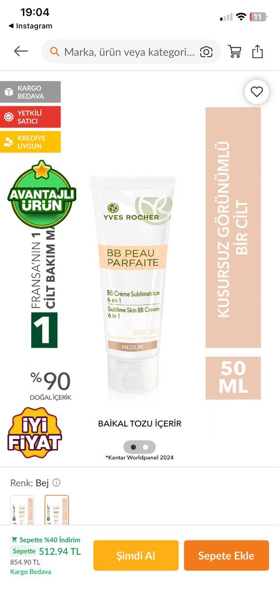Yves Rocher Bej BB Krem 50 ml, %90 doğal içerik ve Baikal tozu ile kusursuz görünüm sağlar. 6'sı 1 arada cilt bakımı sunar.