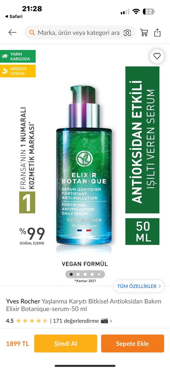 Yves Rocher %99 doğal içerikli, antioksidan etkili, cildi aydınlatan yaşlanma karşıtı serum. Vegan formüllü, 50 ml. ✨ %75 dolu