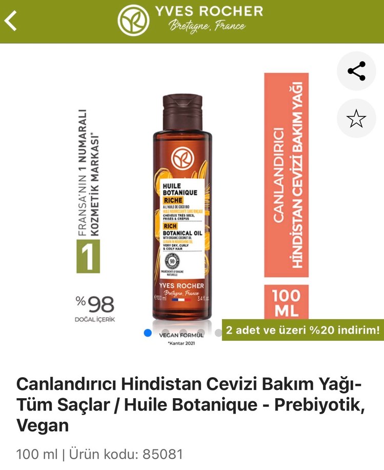 Yves Rocher markasına ait, organik hindistancevizi yağı içeren botanik yağlarla zenginleştirilmiş, çok kuru ve kıvırcık saçlar için saç yağı Az kullanılmıştır.