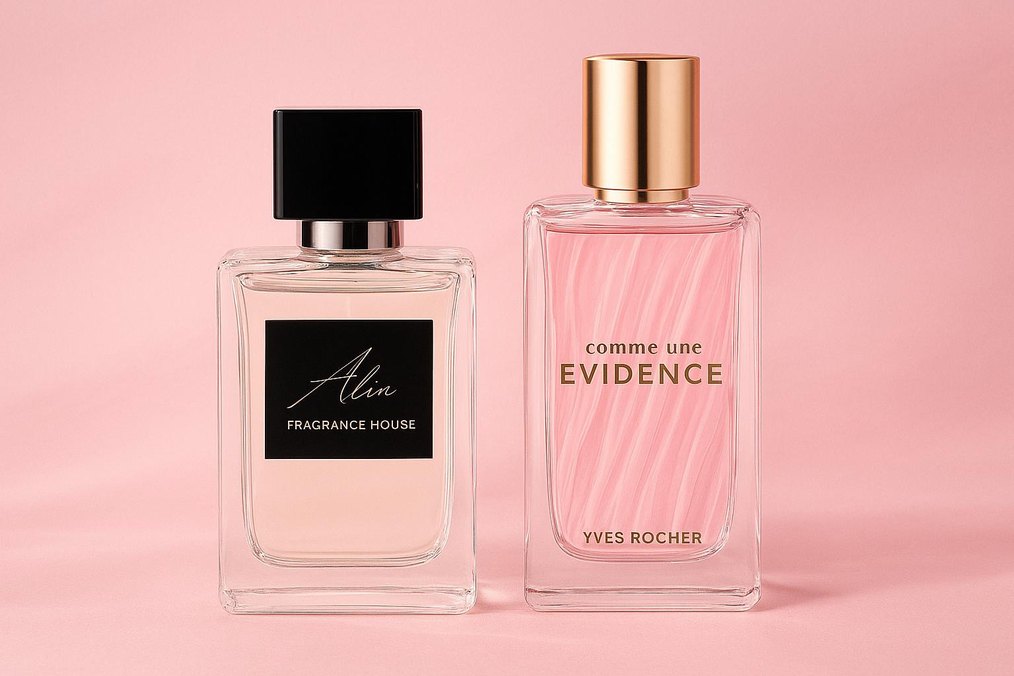 Yves Rocher Comme Une Evidence kadın parfümü, altın kapaklı şeffaf pembe şişede, zarif bir koku deneyimi sunar.