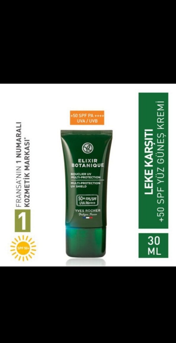 Yves Rocher Elixir Botanique yüz kremi, SPF 50 ve UVA/UVB koruması sunar. Leke karşıtı etkisi ile cildi korur. 30 ml.