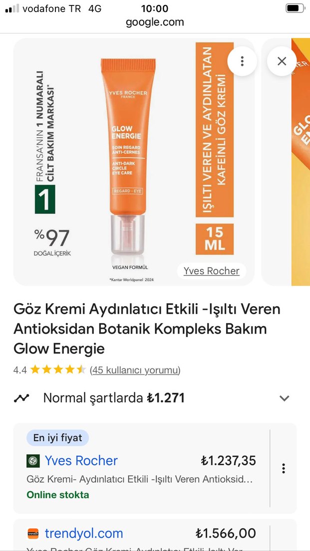 Yves Rocher Glow Energie göz kremi, antioksidan botanik kompleksle göz çevresini aydınlatıp ışıltı verir. %97 doğal içerik, 15 ml.
