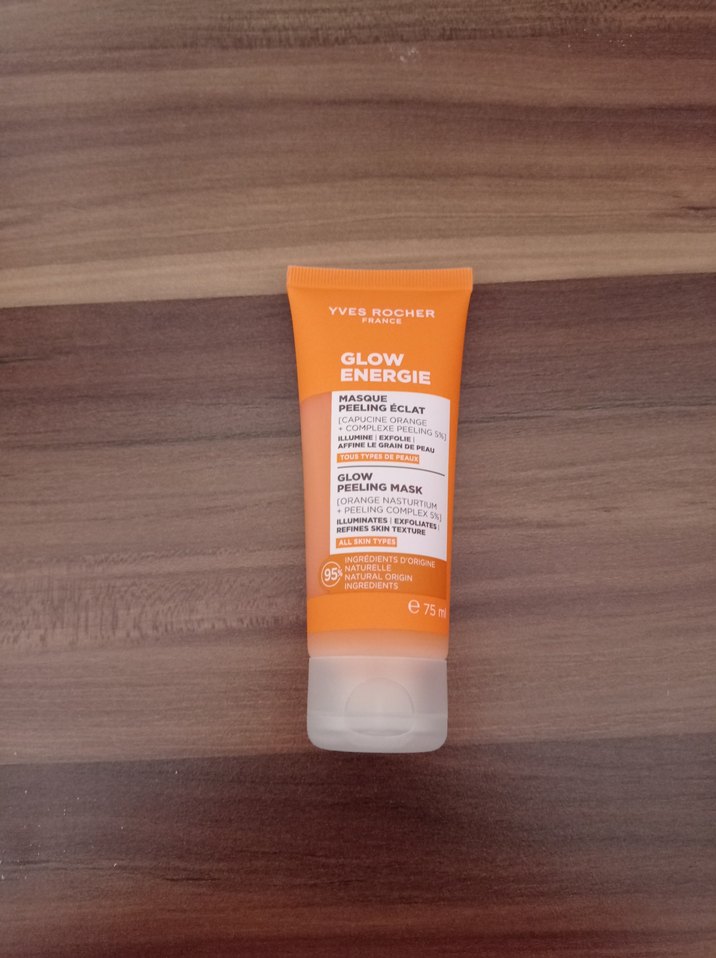 Yves Rocher Glow Energie Peeling Maskesi, cildi nazikçe peeling yapar ve aydınlatır. %95 doğal içeriklerle 75 ml ürün.