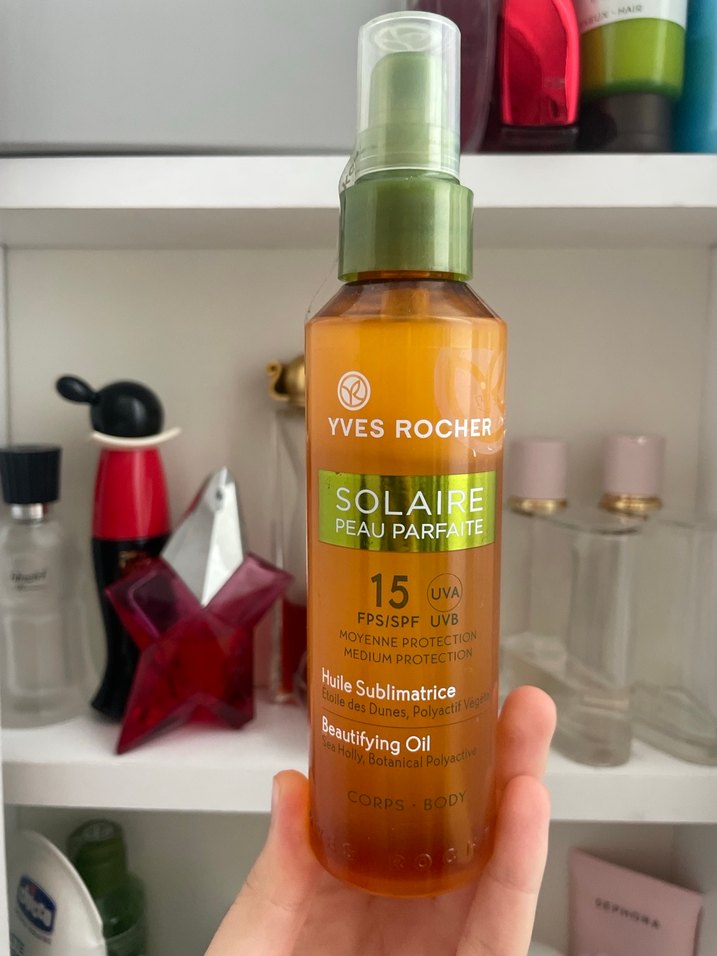 Yves Rocher Güzelleştirici Güneş Yağı, SPF 15 ile orta düzeyde güneş koruması sağlar. Bitkisel polifenoller içerir, cildi korur ve güzelleştirir.