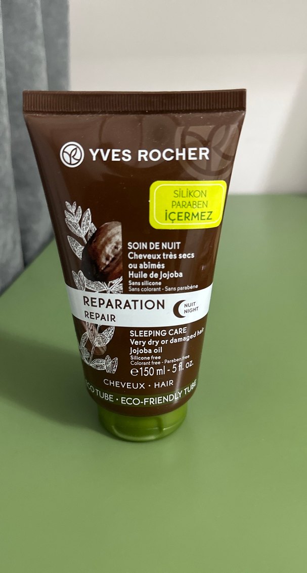 Yves Rocher Jojoba yağı içeren gece saç bakım kremi, çok kuru veya yıpranmış saçları onarır. Silikon ve paraben içermez, gece boyunca besler.