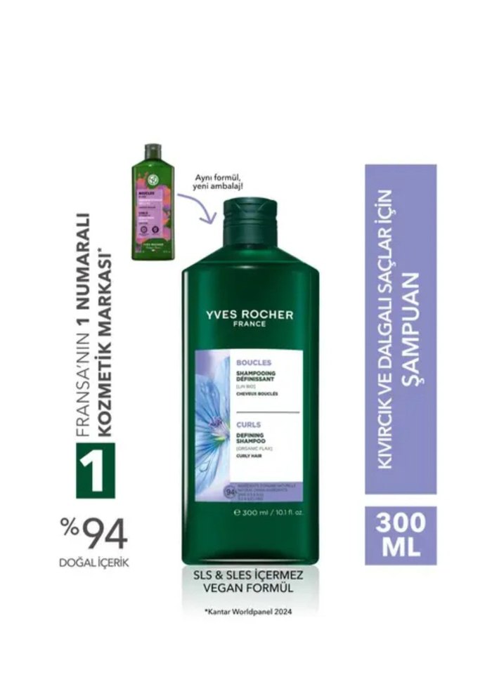 Yves Rocher kıvırcık ve dalgalı saçlar için %94 doğal içerikli, SLS ve SLES içermeyen vegan formüllü 300 ml şampuan.
