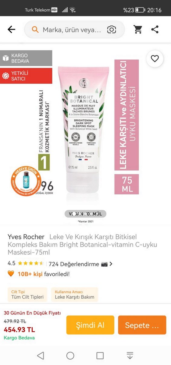 Yves Rocher Bright Botanical vitamin C içeren, leke ve kırışık karşıtı gece maskesi. Tüm cilt tipleri için uygundur. Yüzde 75 doludur