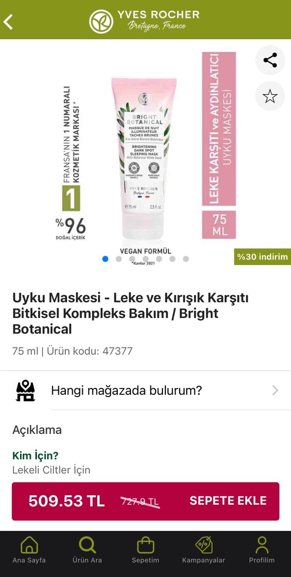 Yves Rocher Bright Botanical uyku maskesi, leke ve kırışıklık karşıtı bitkisel kompleks bakım sunar. %96 doğal içerikli, vegan formüllüdür ve lekeli ciltler için uygundur. 75 ml dir. Hiç kullanılmamıştır. SKT:09/2028 dir. #yvesrocher #lancome #bioderma