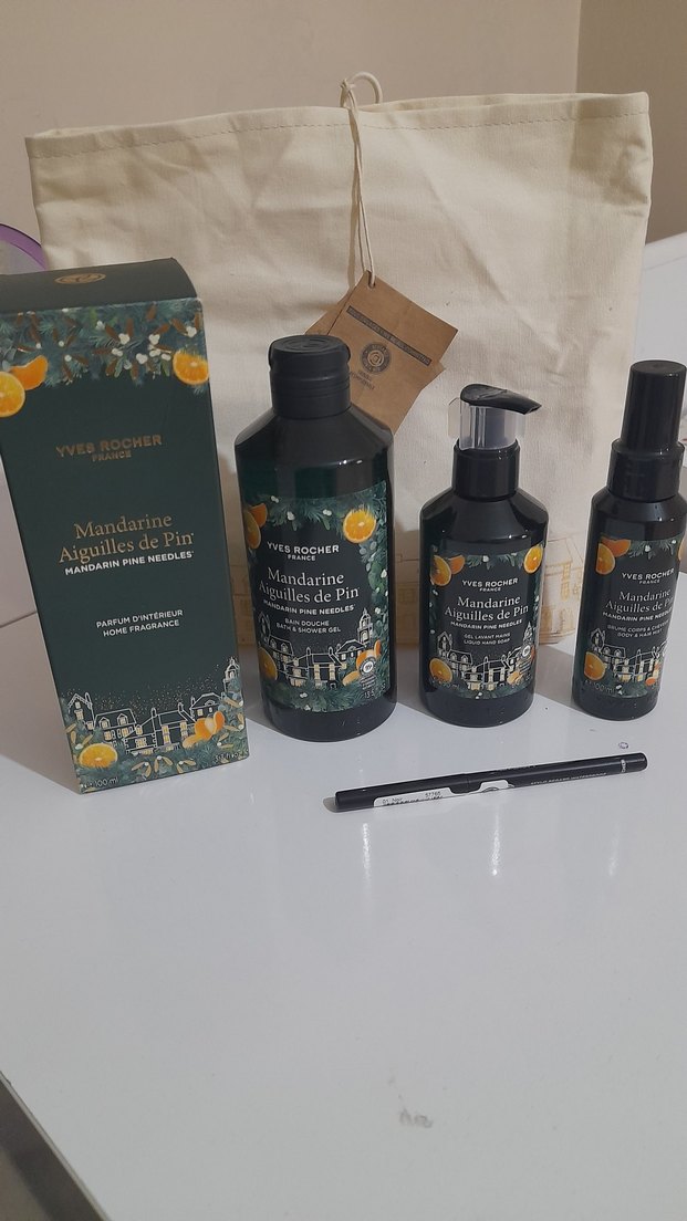Yves Rocher markalı, mandalina ve çam iğnesi kokulu bakım seti. Parfüm, şampuan, losyon ve sprey,göz kalemi içerir.