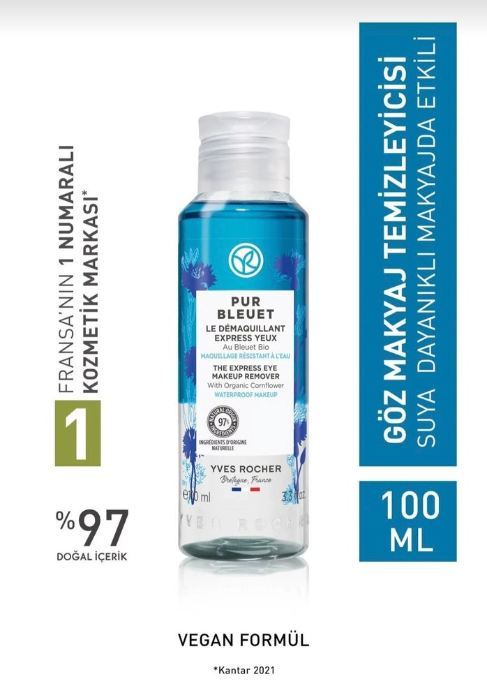 Yves Rocher mavi kantaronlu göz makyaj temizleyici, suya dayanıklı makyajı etkili çıkarır, %97 doğal içerik ve vegan formüle sahiptir. 100 ml.