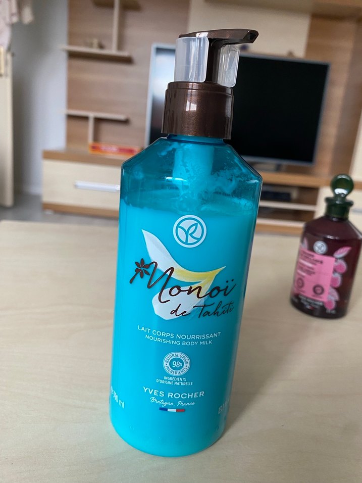 Yves Rocher Monoi de Tahiti besleyici vücut sütü, pompalı mavi şişede sunulur. Cildi yumuşak ve nemli tutar.