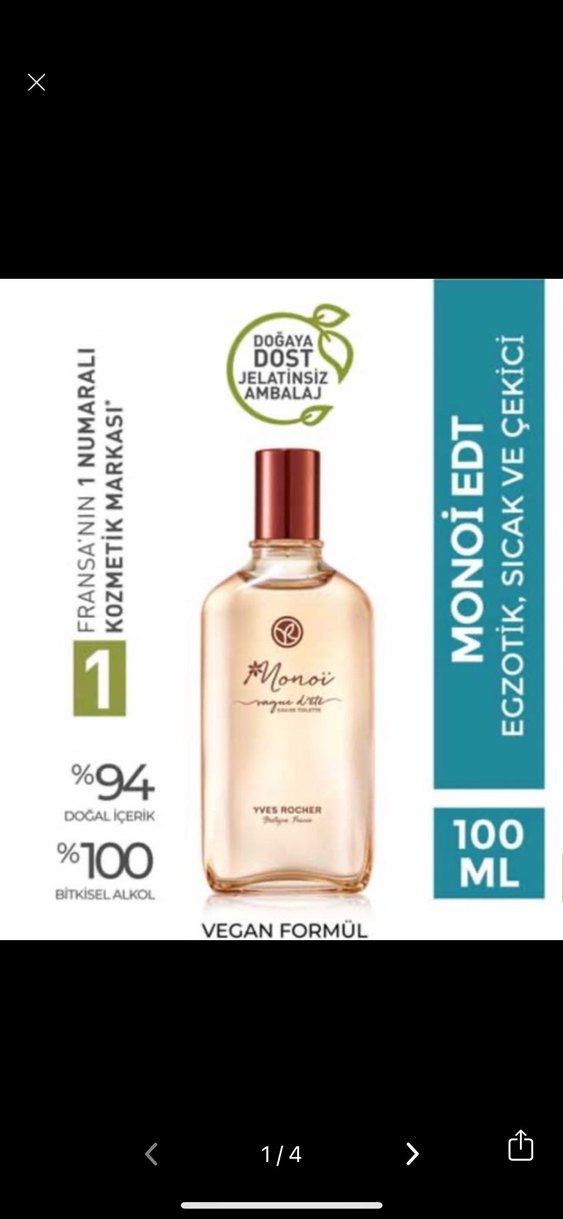Yves Rocher Monoi EDT 100 ml kadın parfümü, egzotik, sıcak ve çekici kokusuyla dikkat çeker. %94 doğal içerik ve %100 bitkisel alkol içerir. Doğaya dost jelatinsiz ambalajı vardır. 2-3 kere kullanılmıştır