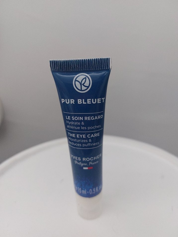 Yves Rocher Pur Bleuet göz bakım kremi, 5ml tüpte nemlendirir ve şişkinlikleri azaltır. Koyu mavi ambalaj rahatlatıcı etkisini vurgular.