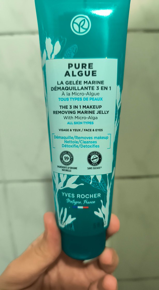 Yves Rocher Pure Algue 3'ü 1 Arada makyaj temizleyici jel, cildi ve gözleri temizler, makyajı çıkarır, detoks etkisi sağlar. Tüm cilt tipleri için uygundur, mikro-alga içerir ve sülfatsızdır. Yarısına kadar kullanildi