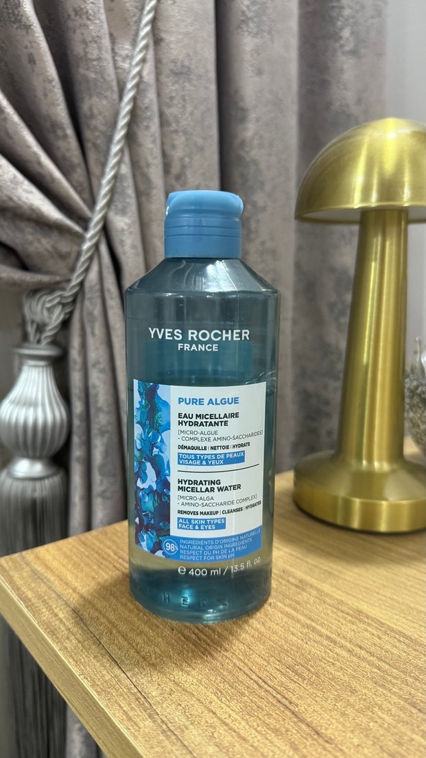 Yves Rocher Pure Algue nemlendirici misel su, mikro-yoğurt ve amino-sakkaritler içerir. Tüm cilt tipleri için makyajı nazikçe temizler ve nemlendirir. Yüz ve göz için uygundur. Benim gözlerimde egzama olduğu için artık kullanamıyorum.
