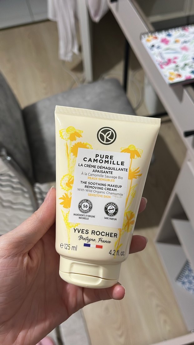 Yves Rocher Pure Camomille, hassas ciltler için yabani organik papatya içeren yatıştırıcı makyaj temizleme kremidir. %94 doğal içerik ve kokusuzdur. 2 kez kullandım