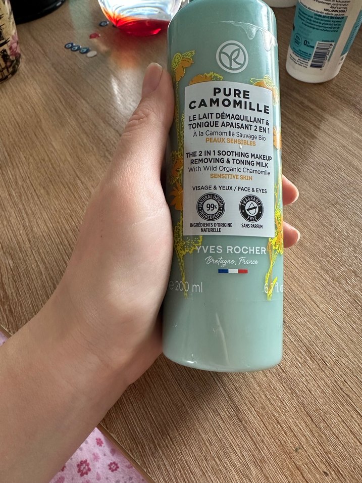 Tamamı dolu bi kez denendi.Yves Rocher Pure Camomille, hassas ciltler için yabani organik papatya içeren, makyaj temizleyici ve tonik süt 2'si 1 arada üründür. %99 doğal içeriklidir.