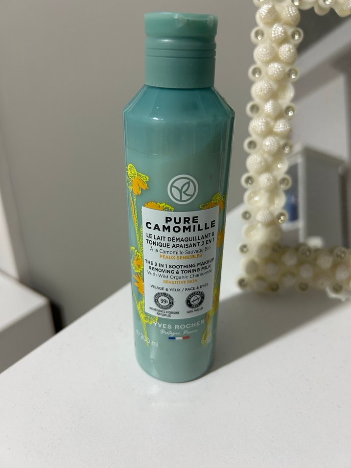 Yves Rocher Pure Kamomil organik yabani papatya içeren 2'si 1 arada yatıştırıcı makyaj temizleyici ve tonik sütüdür. Yüz, göz ve dudak için uygundur.