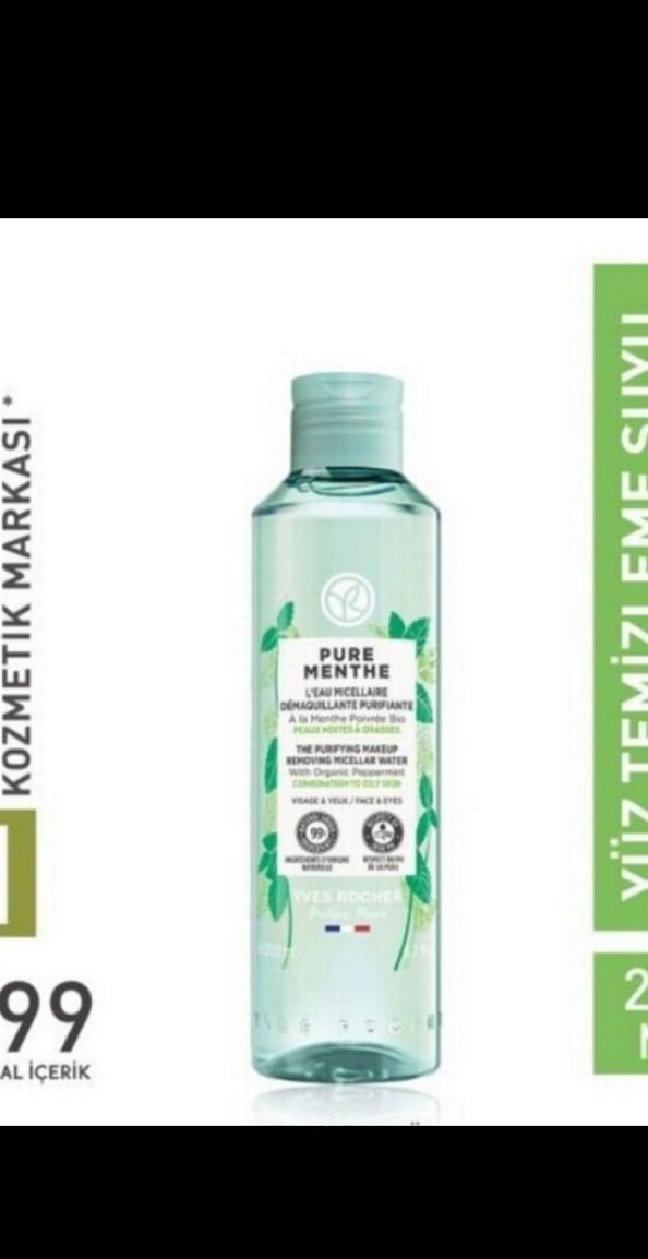 Yves Rocher Pure Menthe makyaj temizleyici su, organik nane ile cildi nazikçe temizler ve makyajı çıkarır. Yüz ve göz için uygundur, ferahlatıcı etkiye sahiptir.