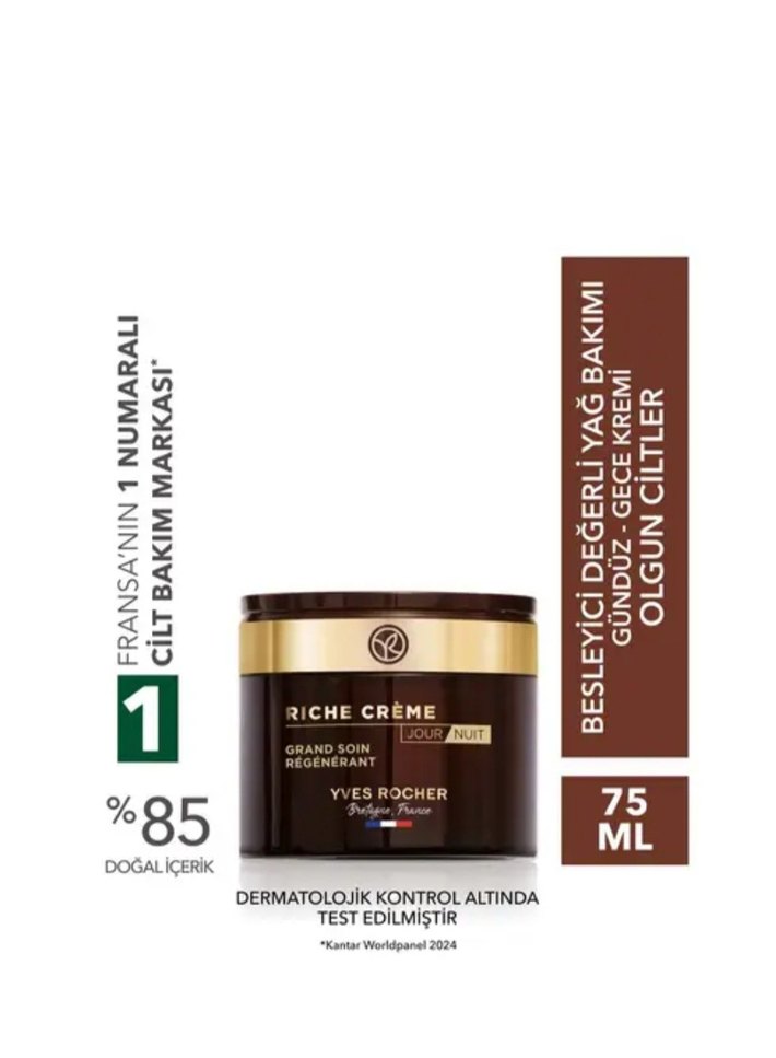 Yves Rocher Riche Crème, %85 doğal içerikli, dermatolojik olarak test edilmiş, gündüz ve gece kullanılabilen besleyici kremdir. Olgun ciltler için uygundur.