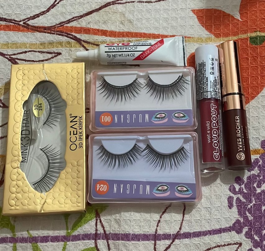 Wet n wild ruj ambalajlı sıfır. 4 cift takma kirpik . Yves rocher ruj kullanılmadı sadece renk denendi
