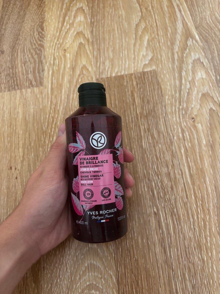 Yves Rocher frambuaz sirkesi içeren parlaklık veren saç sirkesi , mat saçlar için nazikçe temizler ve parlaklık katar. 400 ml şişe.