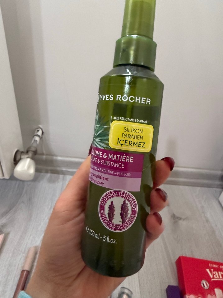 Yves Rocher saç spreyi, silikon ve paraben içermeyen, ince ve düz saçlar için hacim ve doku kazandırır.
