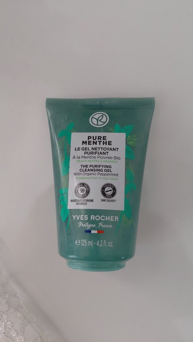 Yves Rocher saf ve ferahlatıcı temizleyici jel, organik nane içerir. Karma ve yağlı ciltler için uygundur, %98 doğal içerik ve sülfatsız formüle sahiptir. 125 ml. birazı kullanılmıştır.