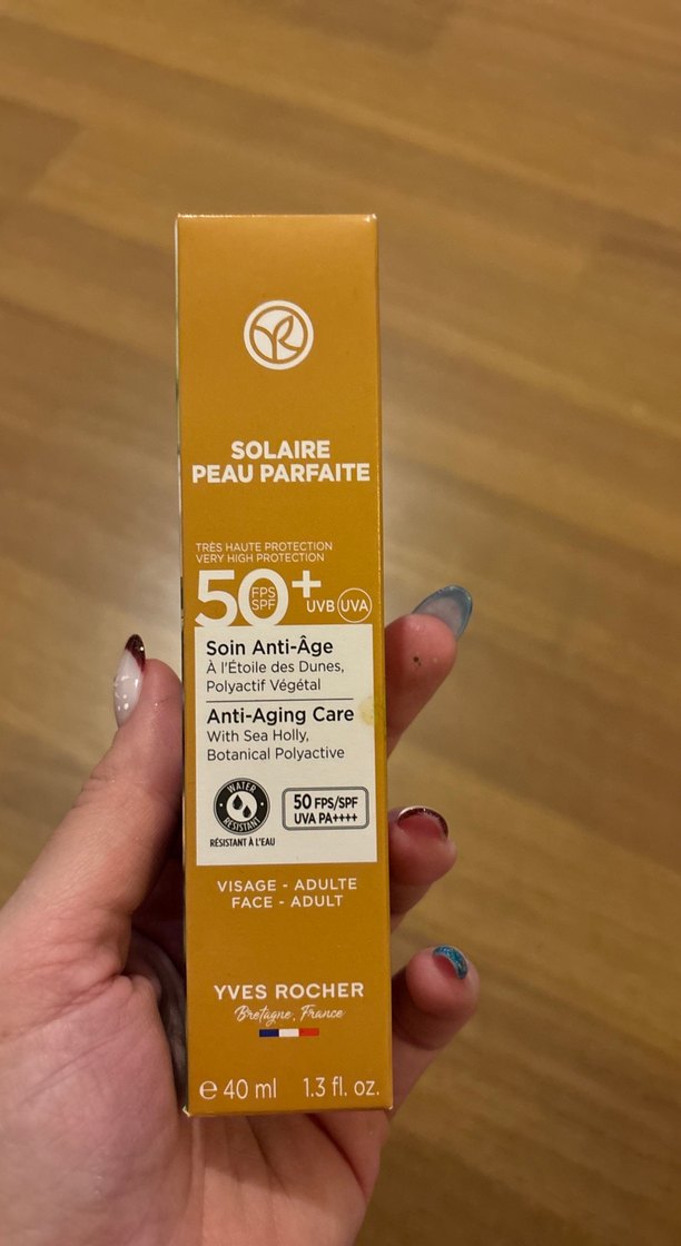 Yves Rocher Solaire Anti-Aging Care, SPF 50 yüksek koruma sağlar. Deniz çiçeği ve bitkisel polyactive içerir. Suya dayanıklıdır, yetişkin yüzler için uygundur.