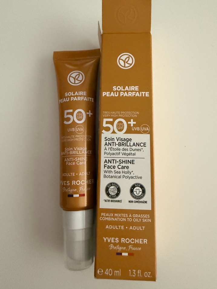 Yves Rocher Solaire Yüz Bakımı, SPF 50+ ile çok yüksek güneş koruması sağlar. Karma ve yağlı ciltler için parlama önleyici özellik taşır, deniz çiçeği ve bitkisel polyactive içerir. 40 ml.hiç kullanılmadı.piyasa fiyatı 900 /1000 tl kapalı kutu