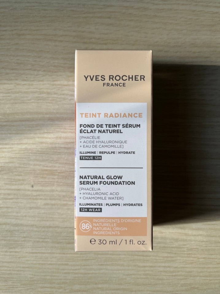 Yves Rocher Teint Radiance serum fondöten, 12 saat kalıcılık sağlar. Işıklandırır, dolgunlaştırır, nemlendirir. İçeriğinde phacelia, hyaluronik asit ve papatya suyu bulunur. %86 doğal içerik.