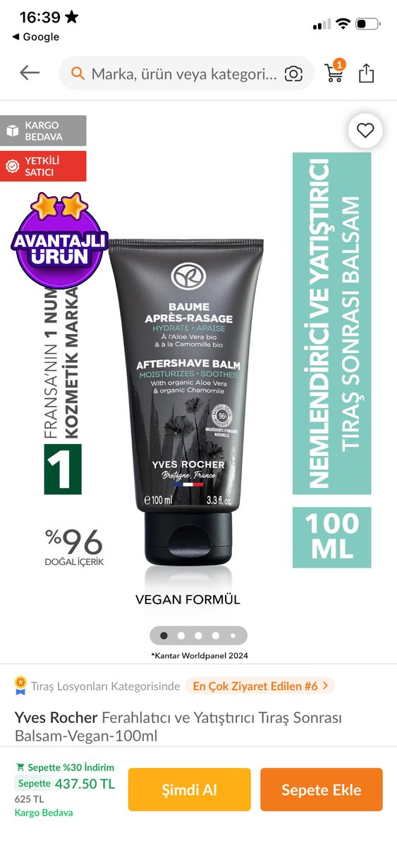 Yves Rocher tıraş sonrası balsam, aloe vera ve organik papatya ile cildi nemlendirir ve yatıştırır. %96 doğal içerik ve vegan formüle sahiptir.