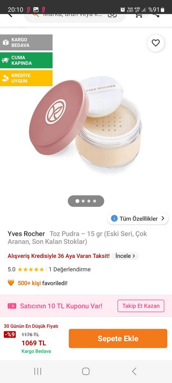 Yves Rocher markasına ait 15 gr bej tonlarında toz pudra. Pürüzsüz bir görünüm sağlar. 10 TL satıcı kuponu ile krediye uygun, 36 aya varan taksit imkanı sunar.