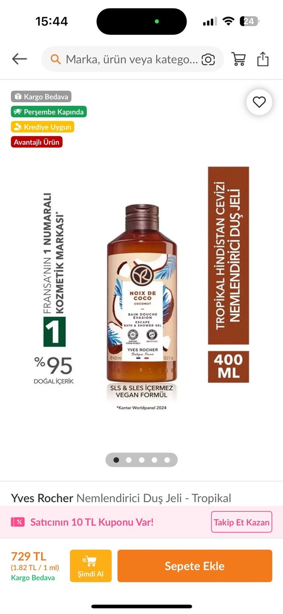 Yves Rocher duş jeli %95 doğal içerikli, tropikal hindistan cevizi kokulu nemlendirici formüle sahiptir. SLS ve SLES içermez, 400 ml hacmindedir.