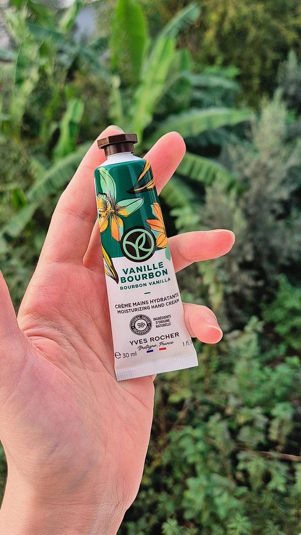 Yves Rocher tarafından sunulan Vanille Bourbon kokulu nemlendirici el kremi. 30ml tüpte, çiçek desenli ambalajda.