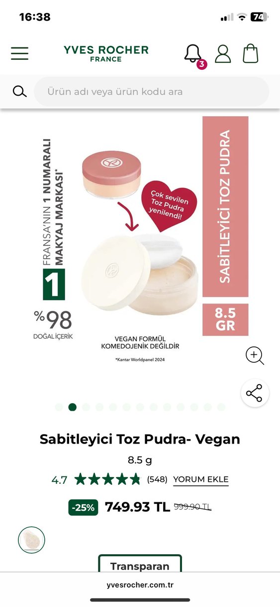 Yves rocher / Vegan Sabitleyici Toz Pudra 8.5g
