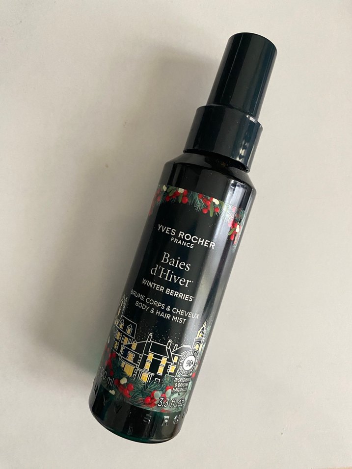 Yves Rocher Winter Berries vücut ve saç spreyi, koyu haki renkte, meyvemsi taze kokulu bir üründür. Cilt ve saç için uygundur. Sıfır.