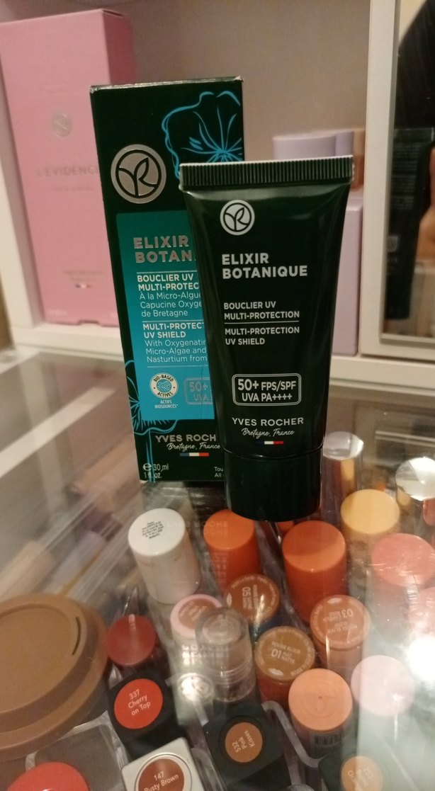 Yves Rocher Elixir Botanique BB krem, koyu haki renginde, UV kalkanı ve SPF 50+ ile çoklu koruma sağlar.
