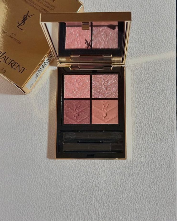 Yves Saint Laurent göz farı paleti, dört açık bej tonunda hafif ışıltılı renkler içerir. Aynalı ve iki aplikatörlü kompakt tasarıma sahiptir.