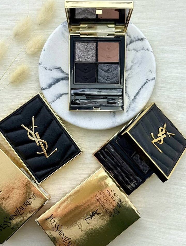Yves Saint Laurent göz farı paleti, siyah, gri ve kahverengi tonlarında dört koyu renkten oluşur. Altın renkli kutu ve ayna içerir, iki aplikatör ile gelir. ✨
