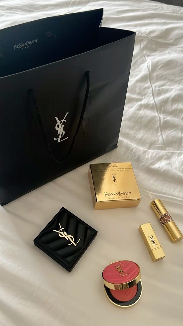 Yves Saint Laurent markalı, parlak altın renkli kompakt, ruj ve diğer makyaj ürünlerinden oluşan şık set.