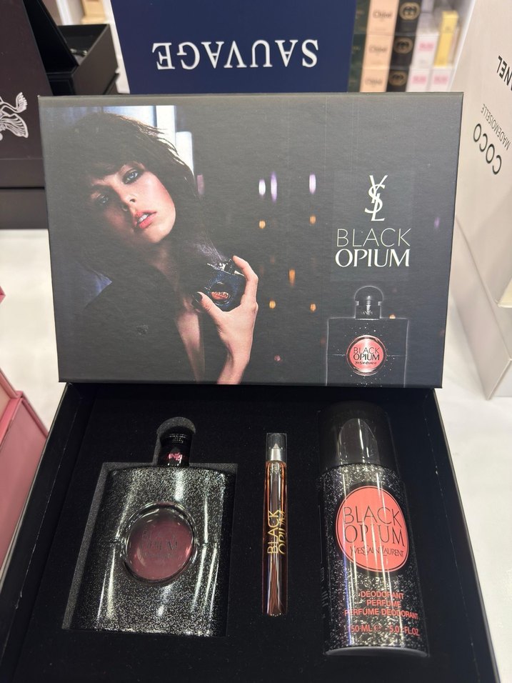 Yves Saint Laurent Black Opium parfüm seti; ışıltılı siyah şişede parfüm, küçük sprey şişesi ve vücut spreyi içerir. Ikonik kokusuyla öne çıkar.