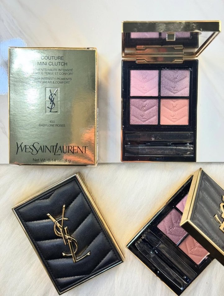 Yves Saint Laurent Couture Mini Clutch far paleti, koyu pembe tonlarda dört renk ve yoğun pigmentasyon sunar. Aynalı kompakt tasarıma sahiptir.