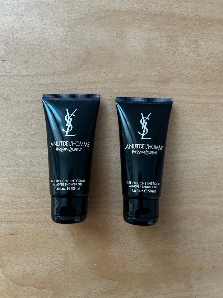 Yves Saint Laurent La Nuit De L'Homme erkek duş jeli seti, her biri 50ml olan iki tüpten oluşur ve ferahlatıcı temizlik sağlar.