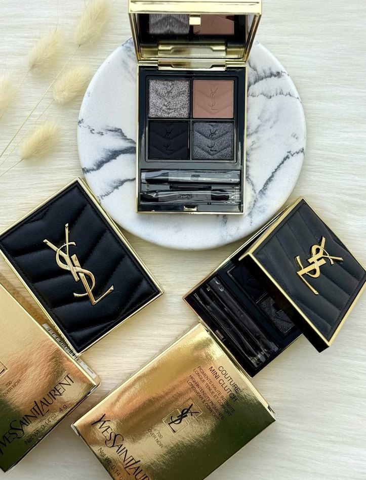 Yves Saint Laurent göz farı paleti, altın renkli kutuda dört koyu ve canlı renkten oluşur. Aynalı ve aplikatörlü, dumanlı göz makyajı için uygundur. ✨