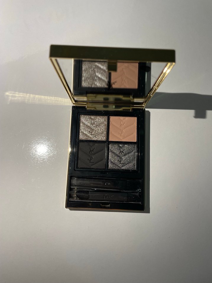 Yves Saint Laurent göz farı paleti, bej ve koyu tonlar dahil dört renkten oluşur, ayna ve çift aplikatör içerir.