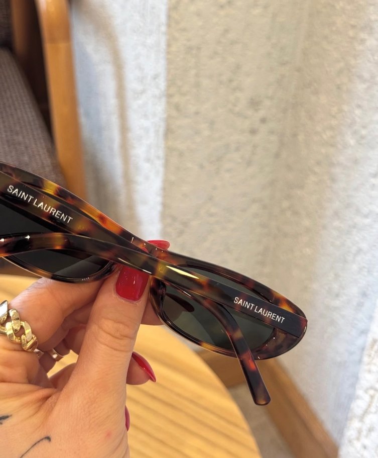 Saint Laurent kadın kahverengi transparan çerçeveli gözlük, koyu renkli ve sokak modasını yansıtan tarzıyla dikkat çekiyor. ️