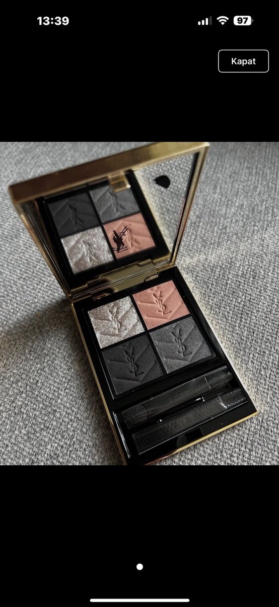 Yves Saint Laurent marka, mat ve parlak bitişli koyu ve gri tonlarda dört renkli far paleti. İki aplikatör ile birlikte sunulur. ✨